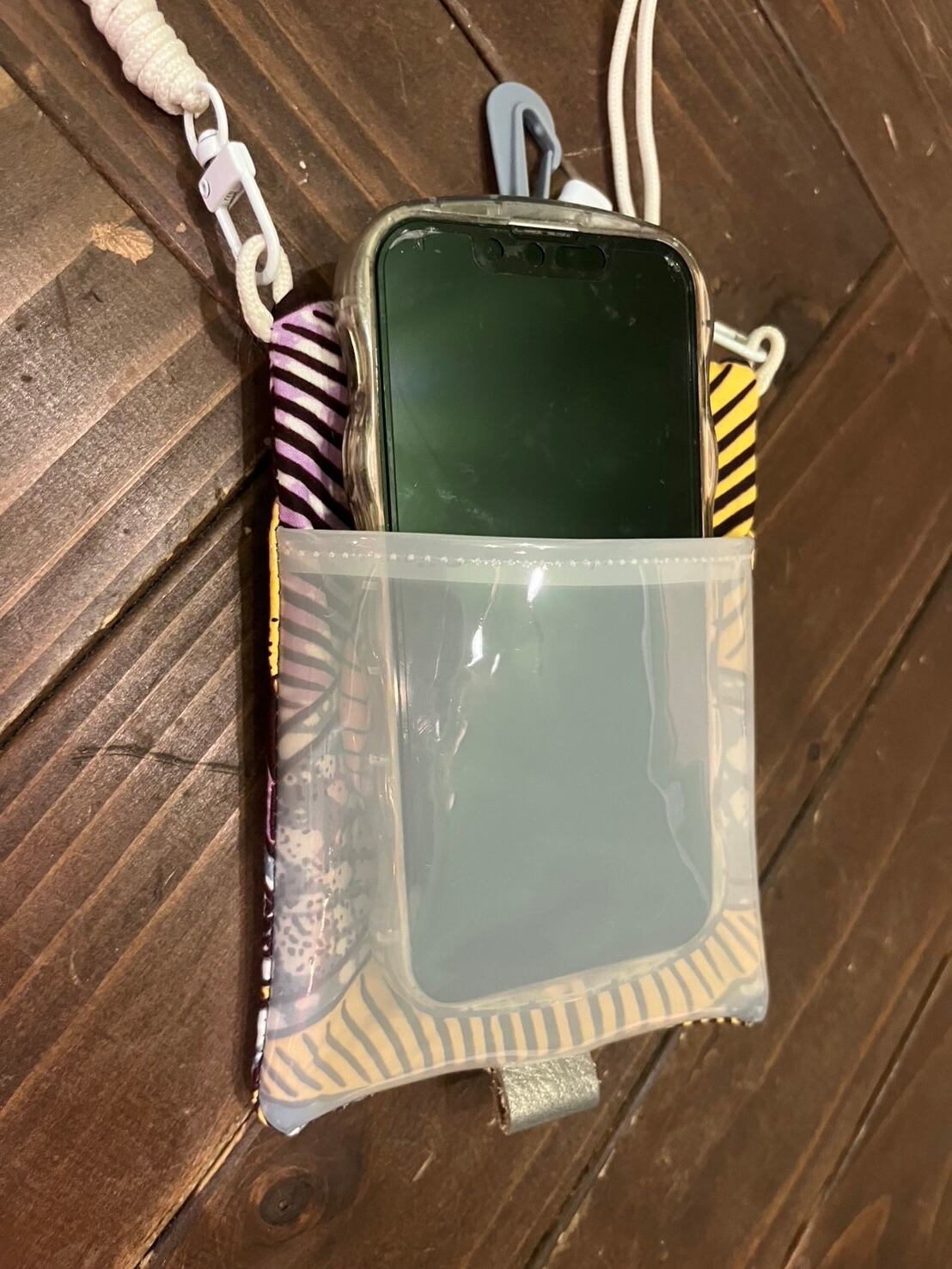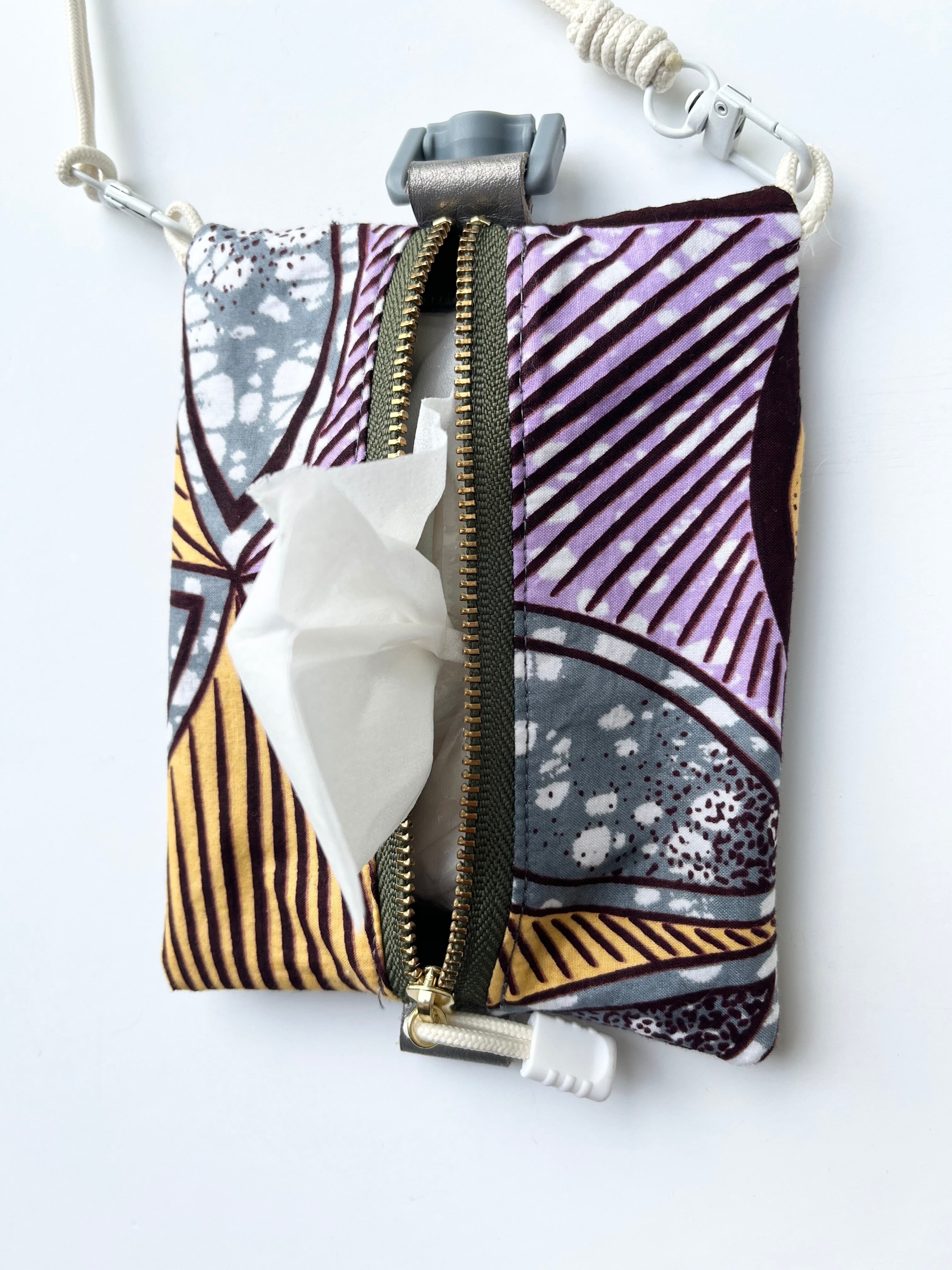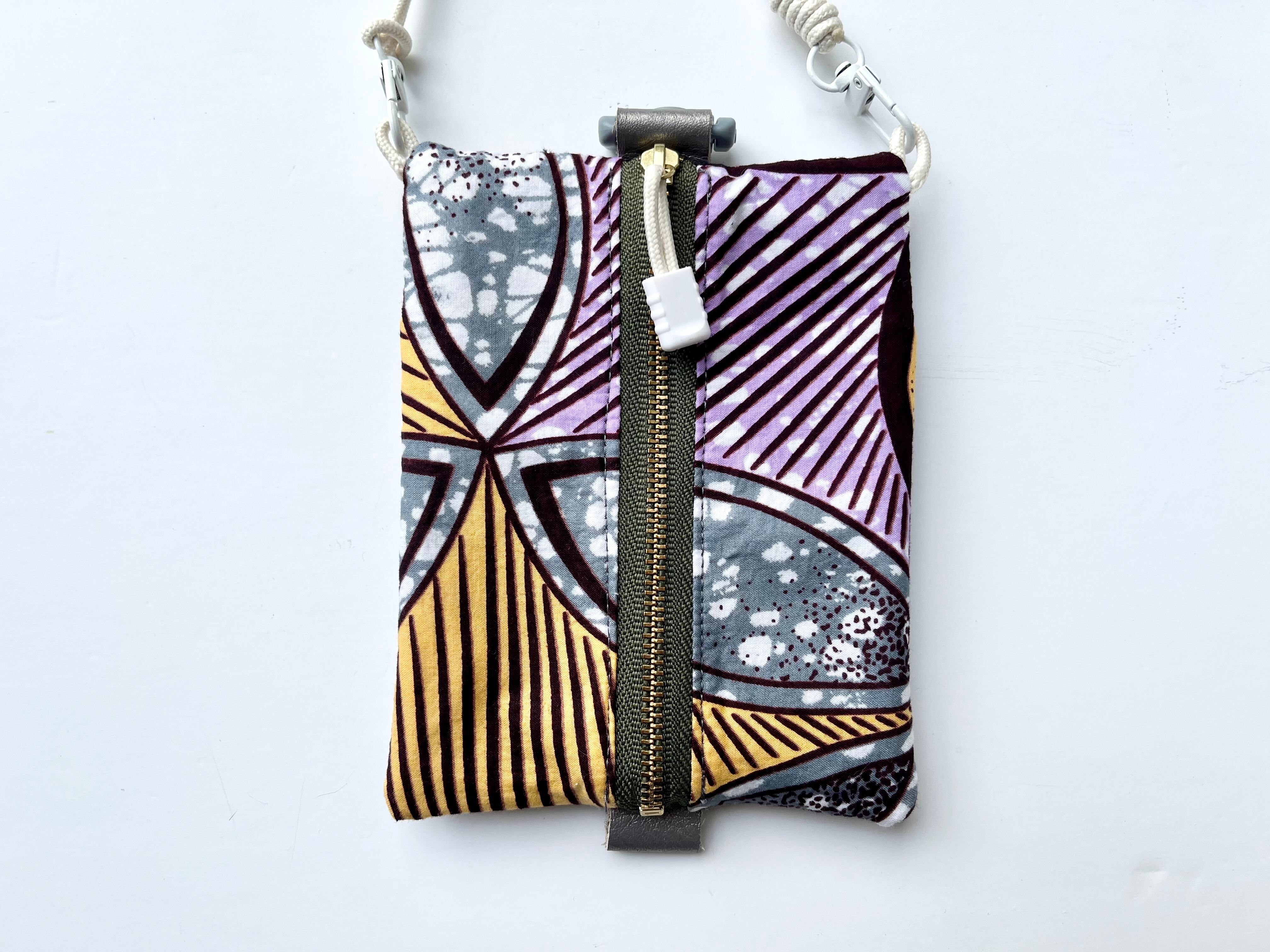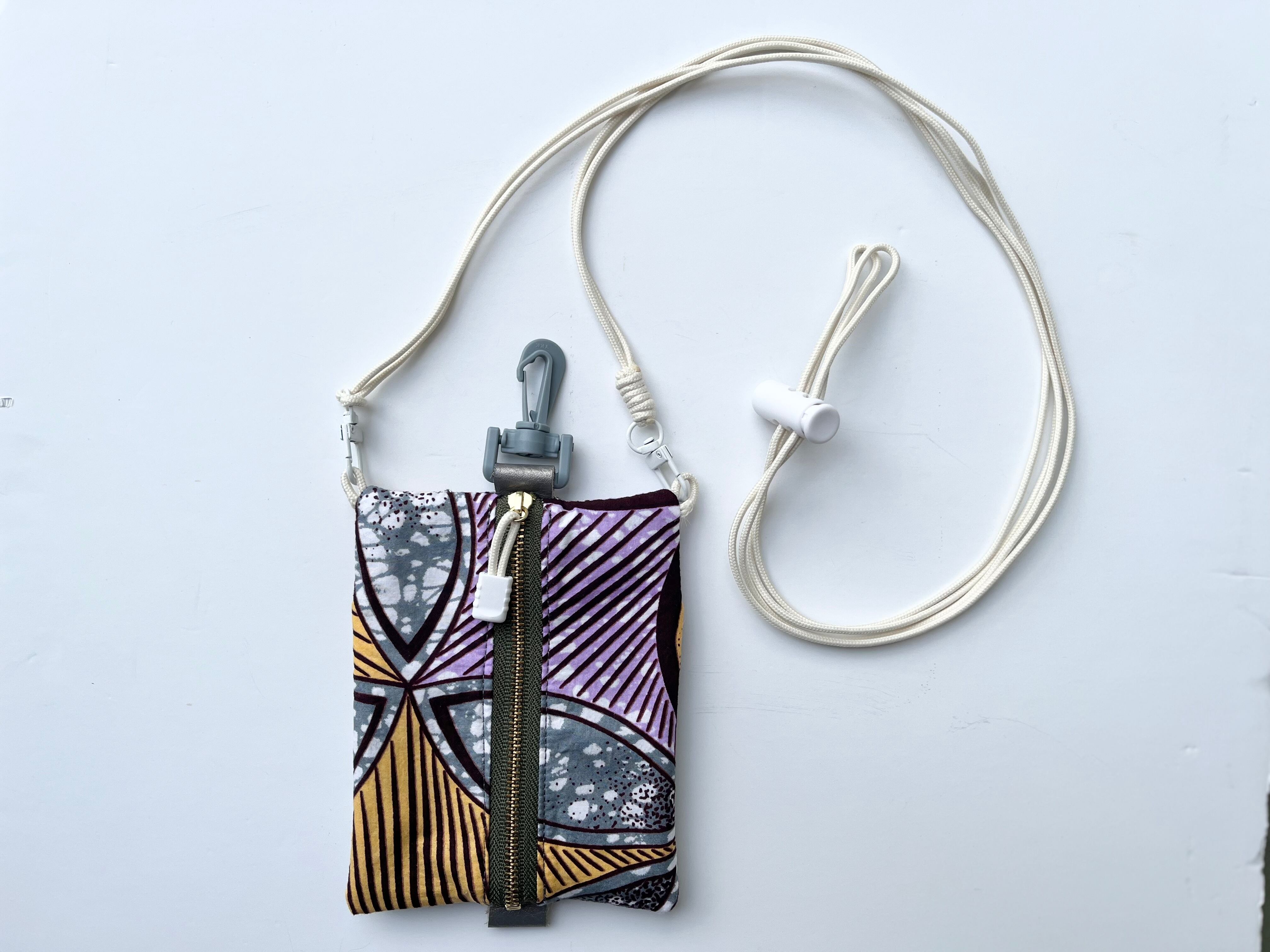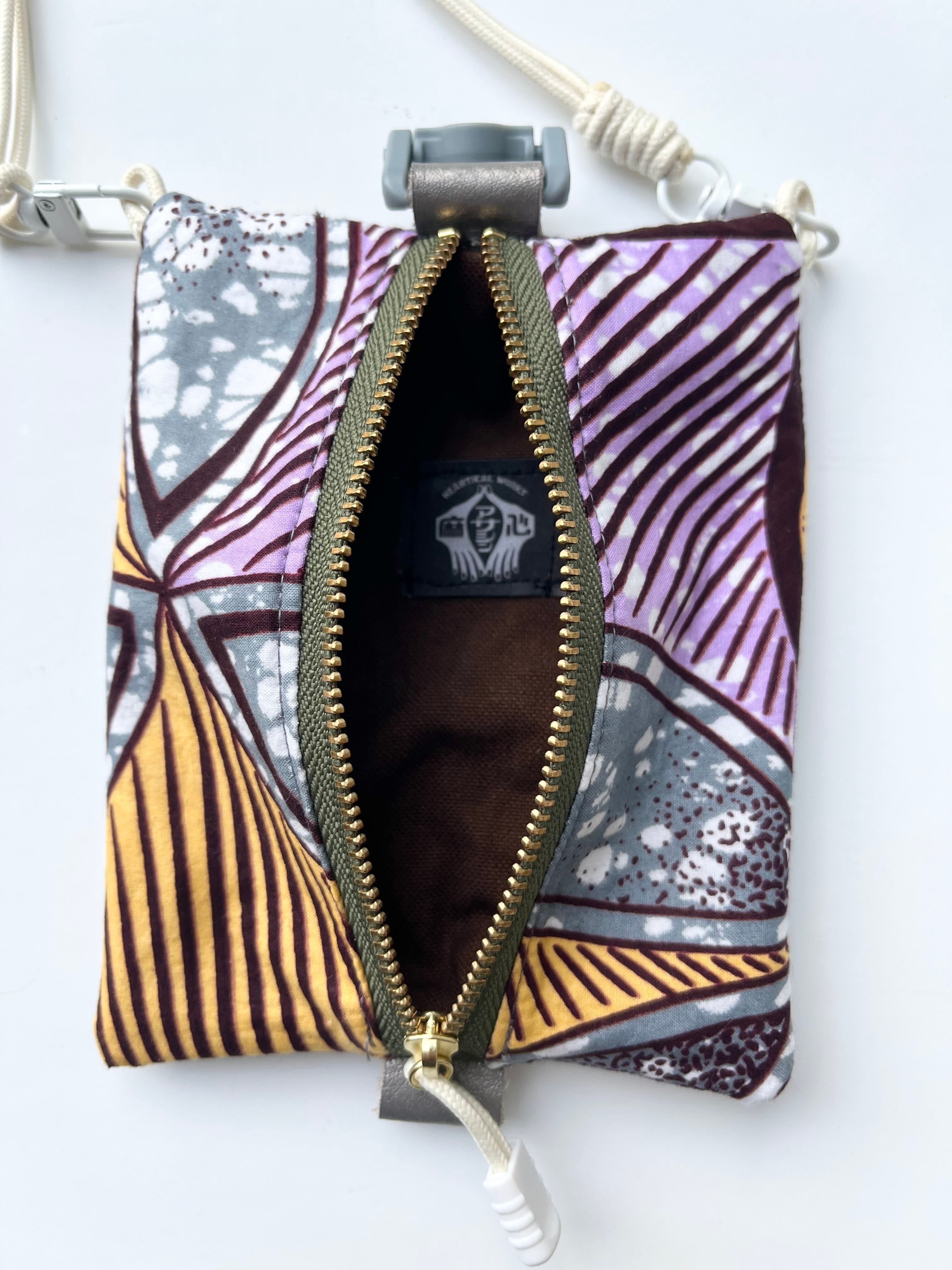 アフリカンファブリックにPVC素材を掛け合わせたスマホや小物をすっきり収納できる、軽量&コンパクトなミニショルダーポーチ。